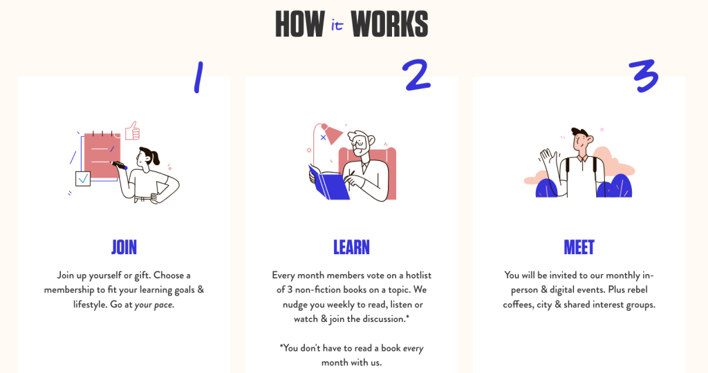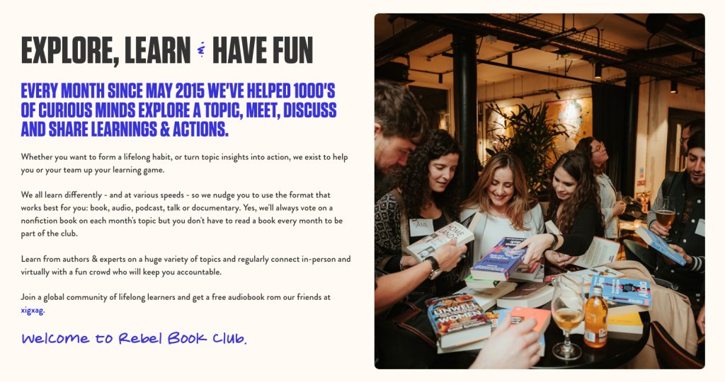 The club helps members stay accountable for their reading and learning habits by connecting them with others through events, “rebel coffees” (one-to-one meetups), and online platforms.